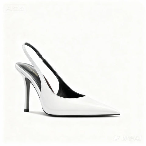 Elevate your footwear collection with our JAIMIE stiletto slingback heeled pumps, expertly crafted in luxurious white patent leather. These pumps blend sleek sophistication with everyday comfort, making them the perfect choice for any occasion. The elegant silhouette features a pointed toe and a refined slingback design, beautifully showcasing your ankle while providing a secure fit.