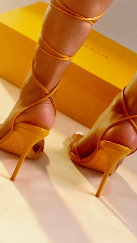 With multiple slim ankle straps, the Flor de Maria Raquel marigold heeled sandals frames and flatters in the most sexy way with an adjustable and comfortable fit, too. She can be worn multiple ways and you can take her from day to evening as easy as 1, 2, 3 ... With a 4" signature heel, it's a showstopper!